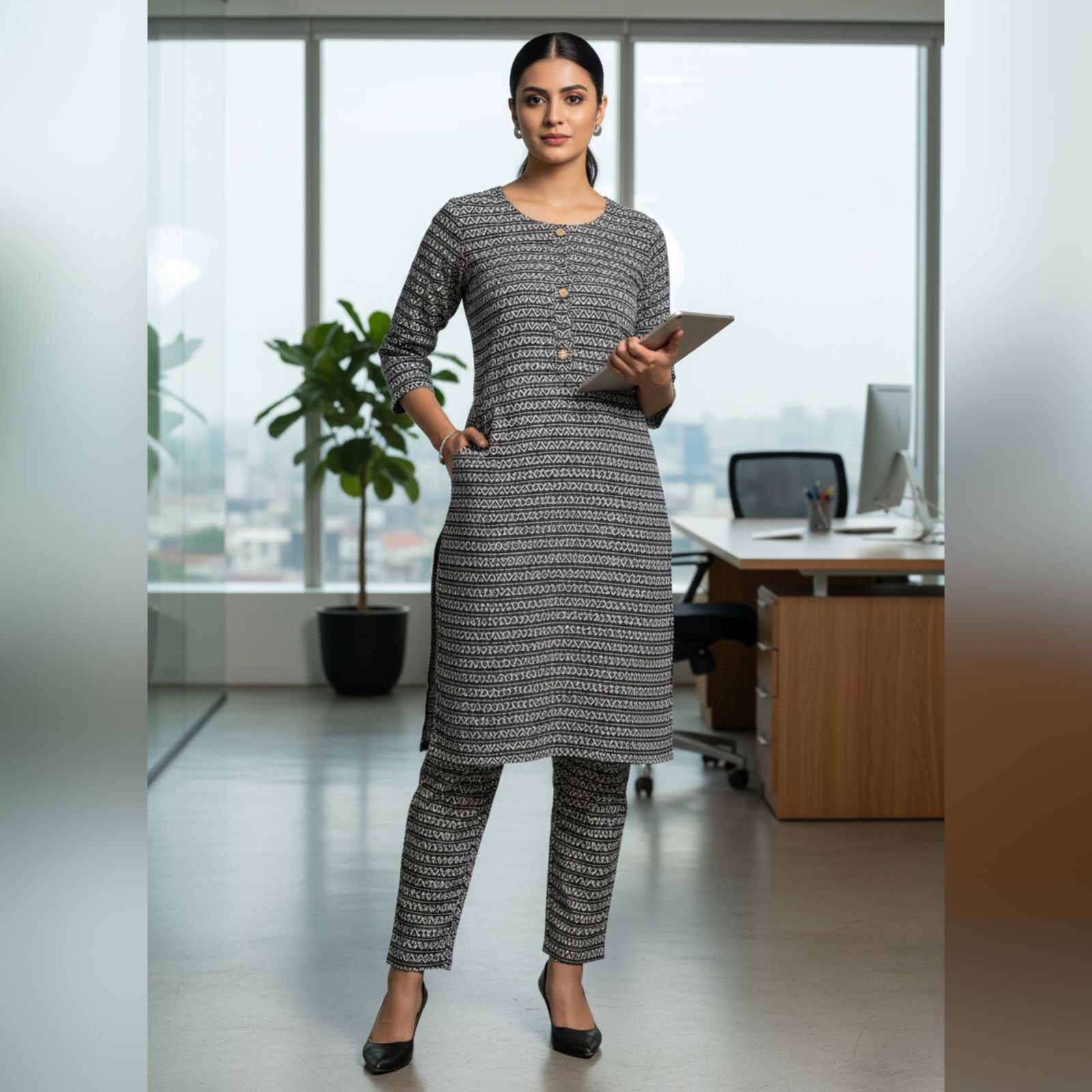 Professional Office Look: Black and White Printed Kurti Set for Women